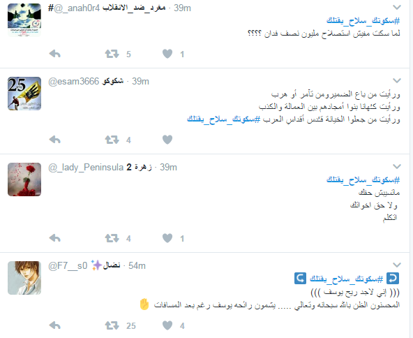 تصدر وسم “سكوتك_سلاح_هيقتلك” موقع التدوينات المصغر “تويتر” اليوم.