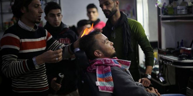 وبخفة يديه، يشعل الحلّاق رمضان عدوان (37 عاماً) النار في شعر الزبون، باستخدام مواد غازية كيميائية، ليبدأ بحلاقة الشعر وتصفيفه بقصّات حديثة لزبائنه الشباب.