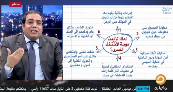 وقال زوبع -في برنامجه مع زوبع على قناة مكملين اليوم- إن هناك 6 أسباب وراء تزايد حالات الاختفاء القسري، أولها تخوف النظام العسكري من أي تحول على الأرض، ومحاولة الحصول عل معلومات حول ما يجري بسيناء تحديدا، وفرض سيطرة أمن الدولة وتعزيز دور الداخلية في حماية نظام السيسي.