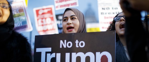 وهتف الحشد “هل ترامب موضع ترحيب للقيام بزيارة هنا؟ لا!”، حاملين لافتات تدعو الى “مقاومة ترامب” و”الدفاع عن المهاجرين”.