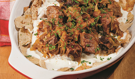 - لتقديم الطبق قبل الأكل مباشرة، يُرص الرقاق في طبق تقديم، ثم توضع طبقة من الزبادي، ثم كباب الحلة على الوجه في المنتصف.