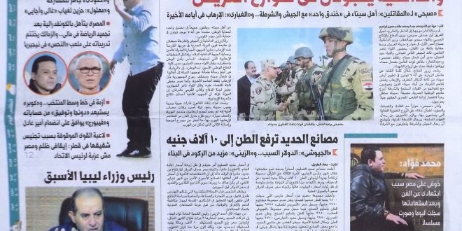 تناولت صحف السبت عدة قضايا؛ حيث أبرزت تصريحات وزيري الدفاع صدقي صبحي والداخلية مجدي عبد الغفار من العريش أنه لا تهاون فى حماية أمن مصر.. وأن سيناء ستظل رمز إرادة الشعب على الإرهاب.. عبدالغفار: الجيش والشرطة في طليعة المحاربين للتطرف.