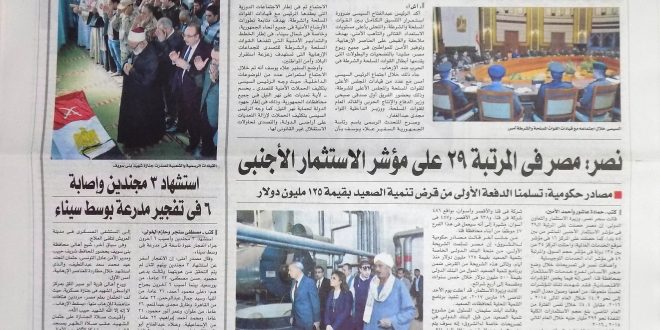 وفي الملف الأمني.. دخلت الحرب في سيناء مرحلة المواجهات المباشرة وتواصل نزيف الدماء المصرية جراء فشل سياسات جنرال العسكر الدموي، حيث أشارت الصحف إلى مقتل 4 مجندين وإصابة 6 فى انفجار عبوة بالعريش.. مسلحون يستهدفون معهدًا أزهريًا بـ”عبوات ناسفة” للمرة الثانية.. في الوقت ذاته أجرت الوطن حوارا مع مستشار كلية القادة والأركان.. “الشهاوى” زعم فيه أن عملية “حق الشهيد” حققت نتائج هائلة فى سيناء رغم مقتل 12 أول من أمس بينهم 5 ضباط ومقتل وإصابة 10 أمس.