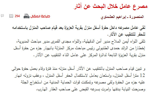 وقد تبين قيام صاحب المنزل بالتنقيب عن الآثار، أسفل منزله منذ فترة وقام بعمل حفرة حوالى 112 متر أسفل المنزل، واستقدم عامل صباح اليوم لاستكمال الحفر أسفل المنزل ، وبعد نزوله انهار عليه جزء من الحفرة ولقى مصرعه فى الحال .