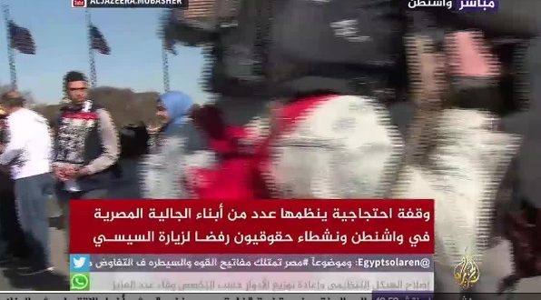 تظاهر المئات من المصريين المقيمين في الولايات المتحدة الأمريكية، احتجاجا على زيارة قائد الانقلاب العسكري، اليوم الاثنين، ونظم العشرات من أبناء الجالية المصرية في واشنطن ونشطاء حقوقيون وقفة احتجاجية أمام نصب واشنطن بالتزامن مع استقبال عبد الفتاح السيسي بأمريكا.