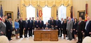 ويظهر السيسي في إحدى الصور التي نشرها ترامب عبر حسابه الرسمي على تويتر، واقفا بجانب موظفي إدارة ترامب بينما يجلس الرئيس الأمريكي على مكتبه.