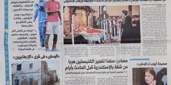 وقالت الوطن إن المساجد والكنائس: وطن واحد ضد الإرهاب.. قداسات عيد القيامة اليوم بلا احتفالات.. و”جمعة”: من مات دفاعًا عن كنيسة كمن مات دفاعًا عن المسجد.. و”اتصالات البرلمان” تطالب بتقديم “جرائم الإنترنت” لمواجهة الإرهاب الإلكترونى.