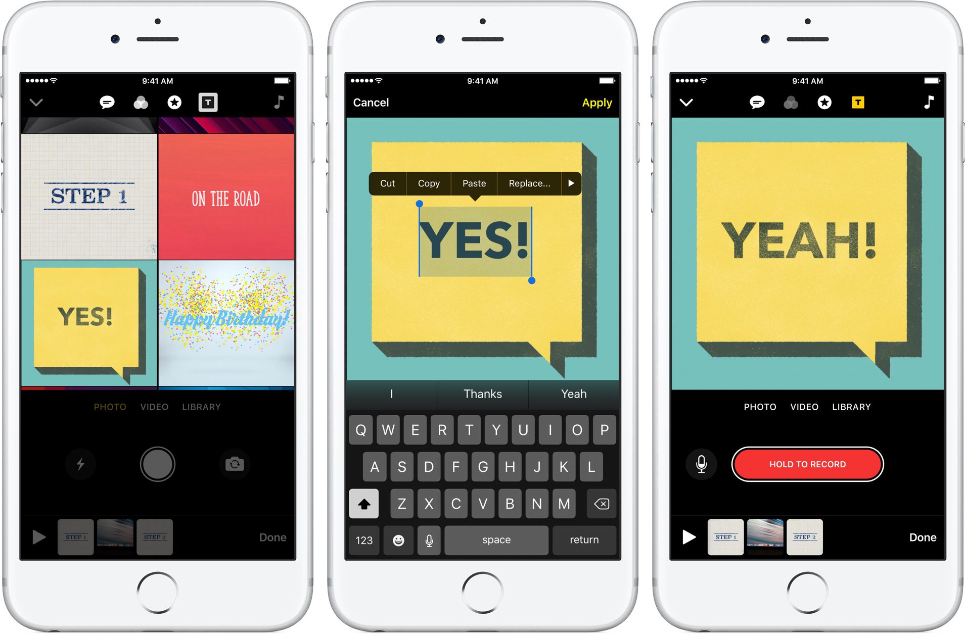 يقدم التطبيق واجهة بسيطة لإلتقاط الصور وتسجيل مقاطع الفيديو والتي يمكن بعدها التعديل عليها. تعتمد آبل الأبعاد المربعة في التصوير كما هو الحال في انستغرام، وهناك إمكانيات متعددة لتخصيص مقاطع الفيديو مثل إضافة الفلاتر والطبقات الإضافية والملصقات وغيرها.