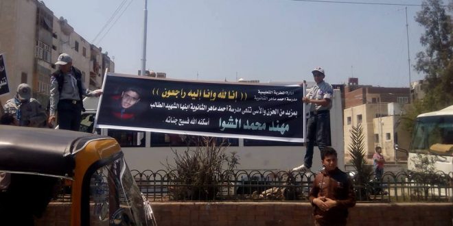 رفع طلاب مدرسة أحمد ماهر الثانوية لافتات نعى لزميلهم الطالب /مهند الشوا بعد وفاته فى حادث أليم.