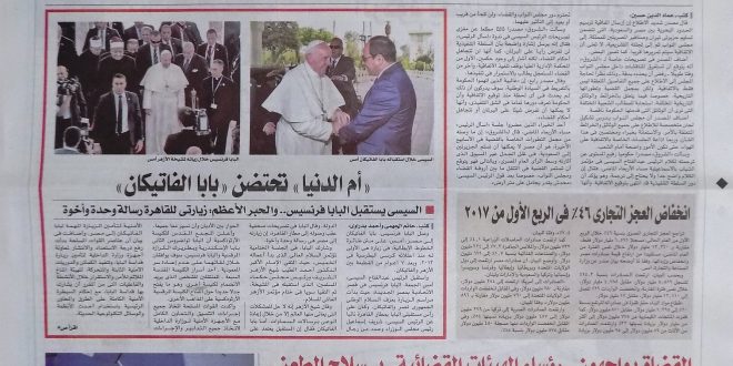 تناولت صحف السبت عدة قضايا، حيث أبرزت زيارة بابا الفاتيكان للقاهرة و ما وصفتها برسائل ومحبة من أرض الكنانة.. ونشرت تصريحات قائد الانقلاب عبدالفتاح السيسي لبابا الفاتيكان: مصر ستظل نموذجًا للإسلام المعتدل.. فرانسيس: ندعم الجهود المصرية لوقف العنف وتحقيق التنمية.. الطيب: الأعمال الإرهابية بعيدة عن قيم الأديان السماوية.. وقالت أخبار اليوم إن بابا الفاتيكان يبدأ زيارته التاريخية باجتماع مع السيسي ويلتقى الطيب وتواضروس.. السيسى: زيارة البابا تحمل رسائل عميقة فى وقت عصيب بالعالم.. فرنسيس يشيد بدور مصر فى تاريخ البشرية والسعى لتحقيق السلام.. والسيسى بعد استقبال “فرانسيس” يقول إن القضاء على الإرهاب يحتاج استراتيجية شاملة لهدم “بنيته التحتية” ومنعه من تجنيد عناصر جديدة.