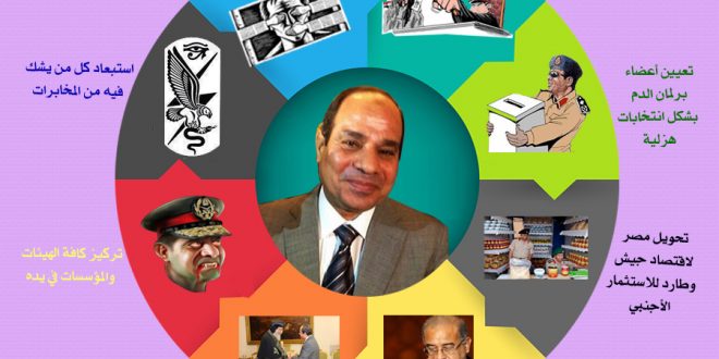 كالسرطان.. سعى السفيه عبد الفتاح السيسي إلى التمدد في كافة المؤسسات والسلطات ليسيطر على كافة السلطات في يده، ضاربًا عرض الحائط بأي خبرات فنية أو سياسية.