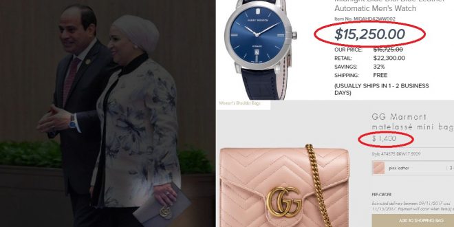 وبحسب ما أظهرته الكاميرات فإن السيسي ارتدى ساعة “Harry winston” بلغ سعرها في الموقع الرسمي للشركة (15250 دولار =  275 ألف جنيه) وحقيبة يد زوجته انتاج شركة “Gucci” الشهيرة بلغت قيمتها (1400 دولار = 25 ألف جنيه).