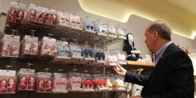 شوهد الرئيس التركي رجب طيب أردوغان أثناء تجوله في أحد المولات التجارية، وأثناء جولته اختار أردوغان مجموعة من ملابس الأطفال لحفيدته من ابنته سمية.