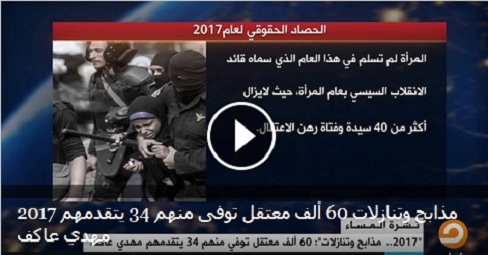 قناة “مكملين” أذاعت تقريرا، مساء أمس الثلاثاء، أشارت فيه إلى أن عام 2017 لم يختلف عن سابقيه منذ الانقلاب العسكري، بل يوصف بأنه الأسوأ على الإطلاق في مجال حقوق الإنسان؛ فقد وثقت المنظمات الحقوقية العشرات من الانتهاكات خلال العام، ووصلت أعداد المعتقلين بسجون الانقلاب إلى أكثر من 60 ألف معتقل من كافة التيارات السياسية، وزادت حملة الاعتقالات مع اقتراب موعد هزلية الانتخابات المقرر عقدها في منتصف العام المقبل، وشهد العام وفاة نحو 34 معتقلا داخل سجون الانقلاب إما بالإهمال الطبي أو التعذيب أبرزهم المرشد السابق لجماعة الإخوان المسلمين محمد مهدي عاكف.