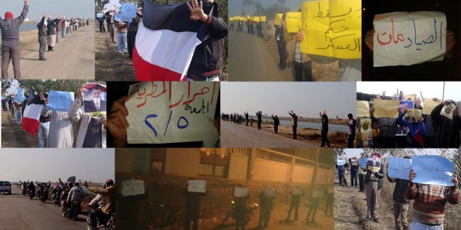 ونظم مناهضو الانقلاب بالمطرية وقفة إحتجاجًية، رفع المشاركون خلالها لافتات توكد ان الدم المصرى رخيص كما رفعوا لافتات مكتوب عليها الصياد مات.