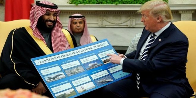 وأضاف: “السعودية بلد ثري جدا، ونأمل أن تعطي الولايات المتحدة بعضا من ثروتها على شكل وظائف وعلى شكل شراء أفضل معدات عسكرية في العالم” ،واحتفل صراحةً بجني 12.5 مليار دولار من إتمام صفقات بيع أسلحة للسعوديين. وابتسم الاثنان ابتسامةً عريضة وهما يستعرضان مُلصقاً يعرض بعض الأسلحة الأمريكية التي تريد السعودية شراءها.