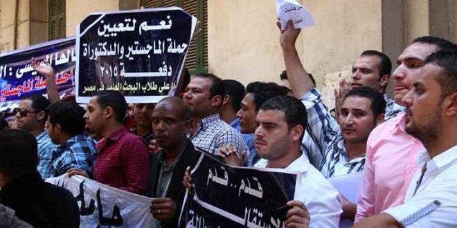 نظم العشرات من حملة الماجستير والدكتوراه، اليوم الأحد، وقفة احتجاجية أمام مجلس وزراء الانقلاب للمطالبة بالتعيين، وذلك للمرة الحادية عشر على التوالى.