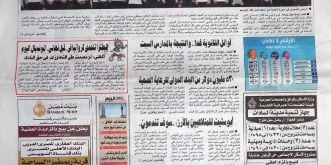 التوجه الأبرز في صحف الأربعاء هو تكريم الجنرال عبدالفتاح السيسي لأبطال مصر الذين شاركوا في دورة ألعاب البحر المتوسط، حيث طالب السيسي بتأهيل الدولة لاستضافة البطولات العالمية، ما دفع وزير الرياضة إلى التصريح بأن مصر سوف تنافس على تنظيم مونديال 2030 وأليمبياد 2026!!.. الموضوع سخيف للغاية، ولا يستحق كل هذه الضجة، ورغم ذلك تناولته مانشيتات :(الأهرام، والأخبار، والمصري، اليوم والشروقن والوطن، واليوم السابع) وكانت صورة السيسي مع هؤلاء اللاعبين تتصدر غلاف جميع الصحف..
