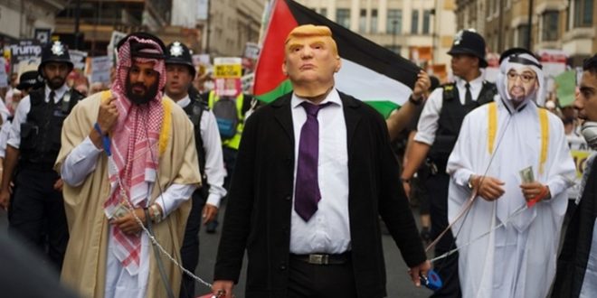 وقال: “نضع هذه الأغلال لنرمز إلى حقيقة أن المال والسلاح هما الأساس الذي تقوم عليه علاقة ترامب مع الخليج. وأما رسن الكلب الذي هنا فيمثل كم هو منقاد ترامب لمحمد بن سلمان ولمحمد بن زايد، ولي عهد أبوظبي”.
