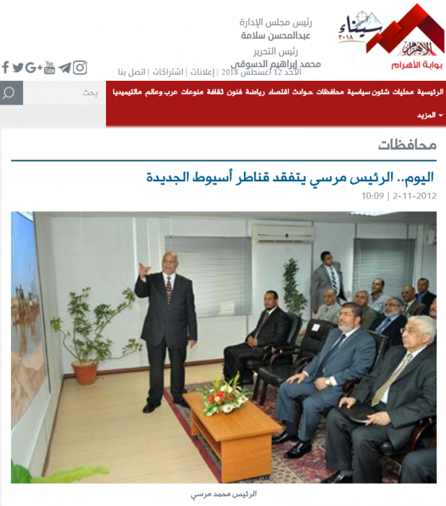 وكانت صحيفة الأهرام الرسمية نشرت بتاريخ 2 نوفمبر 2012 خبرا بعنوان: اليوم.. الرئيس مرسي يتفقد قناطر أسيوط الجديدة