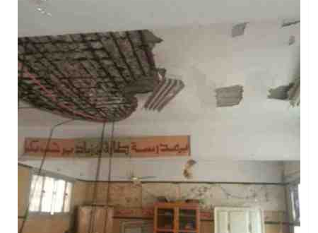 ونقل ناشطون صورا لانهيار السقف على الكراسي الخشية والتي كان من المفترض أن يجلس عليها التلاميذ.