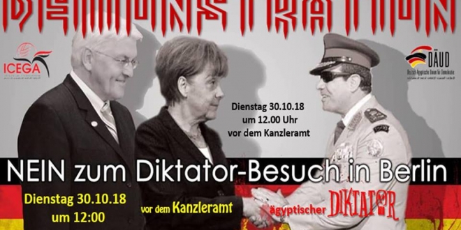 ينظم الائتلاف العالمي للمصريين بالخارج بمشاركة الائتلاف المصري الألماني لدعم الديمقراطية فعالية غدًا الثلاثاء رفضًا لزيارة السيسي قائد الانقلاب لألمانيا واستقباله في برلين.