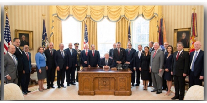 وبدا السيسي في الصورة وكأنه أحد أعضاء فريق ترامب، بعدما اصطف السيسي والوفد المرافق له على يمين ترامب الذي كان جالسًا على مقعد المكتب، بينما وقف مساعدو ترامب على يساره.