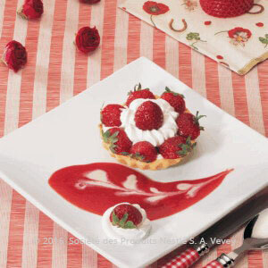 يوضع حليب نستله المكثف المحلّى مع مسحوق الكاسترد، وصفار البيض، وخلاصة الفانيلا داخل وعاءٍ كبيرٍ للصلصة. ثم تُحرّك المكوّنات بواسطة خفّاقةٍ حتى تمتزج جيداً بعضها مع بعض.يُضاف الماء المغلي تدريجيّاً مع التحريك المستمر حتى يبدأ المزيج بالغليان ويُحرّك المزيج على نارٍ خفيفةٍ لمدّة دقيقة إلى دقيقتين. ثمّ يُرفع عن النار ويوضع جانباً ليبرد.تُمزج الزبدة مع البسكويت المطحون داخل وعاءٍ ثم يتم الضغط على المزيج عند قاعدة وجوانب قالب التورتة ذي قطر 26 سم وقاعدة قابلة للفصل.يُمرغ مربى الفراولة فوق القاعدة ثم يُسكب مزيج الكريما المبرّد فوق مربى الفراولة ويُملّس الوجه. تُبرّد التورتة لمدّة 2 إلى 3 ساعات.تُزيّن التورتة بالفراولة الطازجة