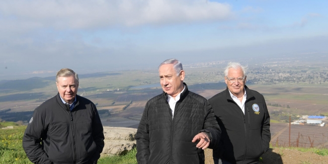 غير أن هذا الزعم لا يستقيم وزيارة رئيس وزراء الاحتلال نتنياهو والسفير الامريكي لدى الصهاينة والسيناتور ليندزي جراهام عضو الكونجرس عن الجمهوريين، للجولان واعلان الأخير سعيه مع عتاة الجمهوريين لأن تكون الجولان تحت السيطرة الصهيونية.