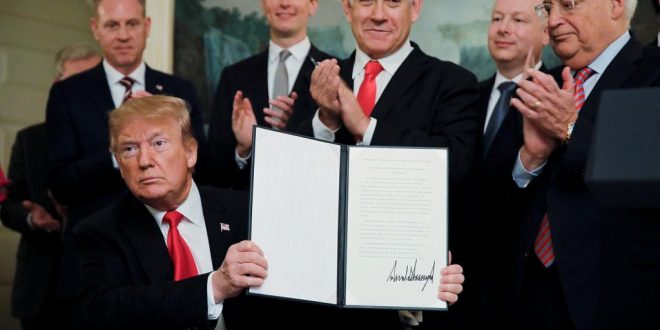 لحظة توقيع ترامب على اعتراف بلاده بسيادة الاحتلال على الجولان