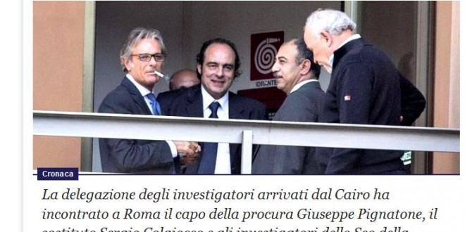 الأربعاء الماضي، غادر وفد مصري إلى إيطاليا يضم كلا من مصطفى سليمان، النائب العام المساعد، ومحمد حمدي، وكيل النائب العام ، واللواء عادل جعفر من قطاع الأمن الوطني بداخلية الانقلاب، واللواء علاء عزمي، نائب مدير البحث الجنائي بمحافظة الجيزة التي وجدت فيها جثة ريجيني، بالإضافة إلى العميدين مصطفى معبد وأحمد عزيز من قطاع الأمن الوطني.