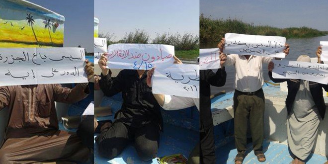 شارك صيادو المطرية فى فعاليات جمعة “الأرض هي العرض”، اعتراضًا على تنازل السيسي عن جزيرتي تيران وصنافير ورفعوا لافتات كتبوا عليها السيسى باع الأرض الدور الجاى على ايه .