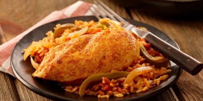 3 – أضيفي الدجاج فوق الأرز واخفضي الحرارة، ثم غطي المقلاة واتركيها على نار هادئة لمدة 25 دقيقة أو حتى ينضج الأرز والدجاج ، اتركيه يبرد قليلا ثم قدميه.