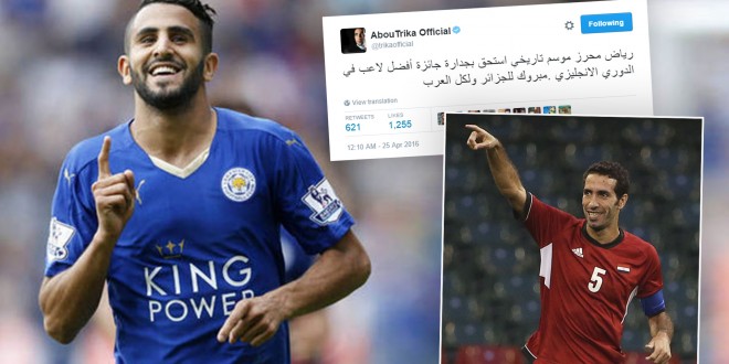 هنأ محمد أبو تريكة، لاعب النادي الأهلي ومنتخب مصر، اللاعب الجزائري رياض محرز، الذي يلعب في صفوف نادي ليستر سيتي الانجليزي.