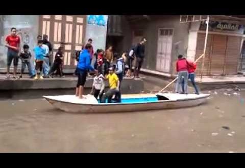الرئيسية / أخبار / شباب يستخدمون مركبة بعد غرق شوارع المطرية دقهلية بمياه الأمطار