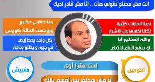 تداول نشطاء عبر مواقع التواصل الاجتماعي، تجميعًا لتصريحات قائد الانقلاب العسكري عبد الفتاح السيسي، منذ انقلابه وحتى آخر خطاباته لتكشف زيف انقلابه وتعمده انهيار مصر وإفلاسها ومواصلة التسول والاستجداء. وعرض الإنفوجراف عددًا من تصريحات السفيه، ومنها: “قعدت 10 سنين ثلاجتي مفيهاش غير الميه”،”انت مش محتاج تقولى هات”، “أنا مش قادر …