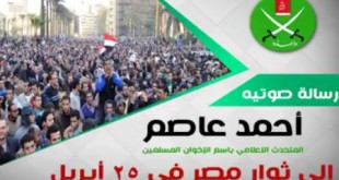 استمع إلى رسالة “أحمد عاصم” المتحدث الاعلامي باسم الإخوان إلى ثوار مصر في 25 أبريل لا تفريط في الأرض .. لا تصالح على الدماء .. لا تنازل عن الحرية للاستماع للتصريح : اضغط هنا
