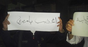 رفع شباب ضد الانقلاب بالمطرية لافته تحمل شعار “اغضب يامصرى” فى جمعة “اغضب” طالبوا المصرين فيها بمشاركتهم فى الغضب لما وصل اليه الشعب من سوء الأحوال الاقتصادية والمعيشية والمطالبة برحيل حكم العسكر.