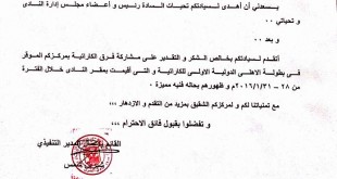 أرسل النادي الأهلي جواب شكر لمركز شباب مدينة المنزلة علي المشاركة في بطولة الاهلي الدولية الاولي للكاراتية والتي اقيمت بمقر النادي خلال الفترة من 28_ 2016/1/31.
