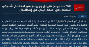 أصدر تنظيم الدولة بيانا رسميا أعلن فيه مسؤوليته عن الهجوم المسلح على ناد ليلي في مدينة إسطنبول التركية خلال احتفالات رأس السنة الجديدة. وقال التنظيم في بيانه إن “أحد جنود الخلافة دك أحد أشهر الملاهي الليلة التي يحتفل فيها النصارى بعيدهم الشركي بالقنابل اليدويه وسلاحه الرشاش حاصدا منهم 150 ما …