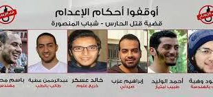 حذرت جهات حقوقية من تنفيذ حكم الإعدام الأسبوع المقبل بحق 6 من شباب محافظة الدقهلية في ما تسمى بهزلية مقتل الحارس رقم 781 لسنة 2014 كلي جنوب المنصورة و المقيدة برقم 26 جنايات أمن الدولة العليا. وأكدت العديد من المنظمات الحقوقية أن أحكام الإعدام مبنية على محاكمات مسيسة وغير عادلة …