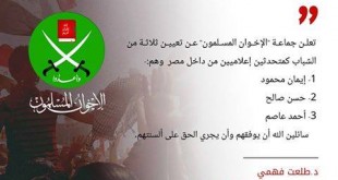أعلنت جماعة “الإخوان المسلمون” عن تعيين ثلاثة من الشباب كمتحدثين إعلاميين من داخل مصر وهم حسب الترتيب الأبجدى: الاستاذ / احمد عاصم 32 سنة الاستاذة / إيمان محمود 22 سنة الاستاذ / حسن صالح 23 سنة كما أعلن مسئول لجنة الادارة العليا د.محمد عبدالرحمن المرسي أن تحديد ثلاثة …